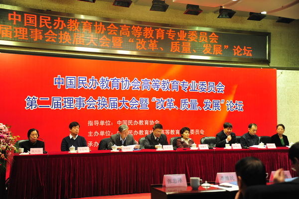 2月20日,中国民办教育协会高等教育专业委员会第二届理事会换届大会暨“改革、质量、发展”论坛在北京国家教育行政学院隆重召开。教育部党组成员、部长助理林蕙青,中国民办教育协会名誉会长陶西平,中国民办教育协会会长王佐书,中国高等教育学会会长翟振元,中国教育学会会长钟秉林,教育部发展规划司司长谢焕忠、副司长郭春鸣等领导出席会议,中国民办教育协会监事会主席、高专委名誉会长胡大白主持会议。来自全国各地的300余名代表参加了会议。我院院长施昌海、常务副院长高云应邀参加会议。原国家教育评估中心主任季平担任新一届理事会会长,我院当选为常务理事单位,院长施昌海当选为第二届理事会常务理事。