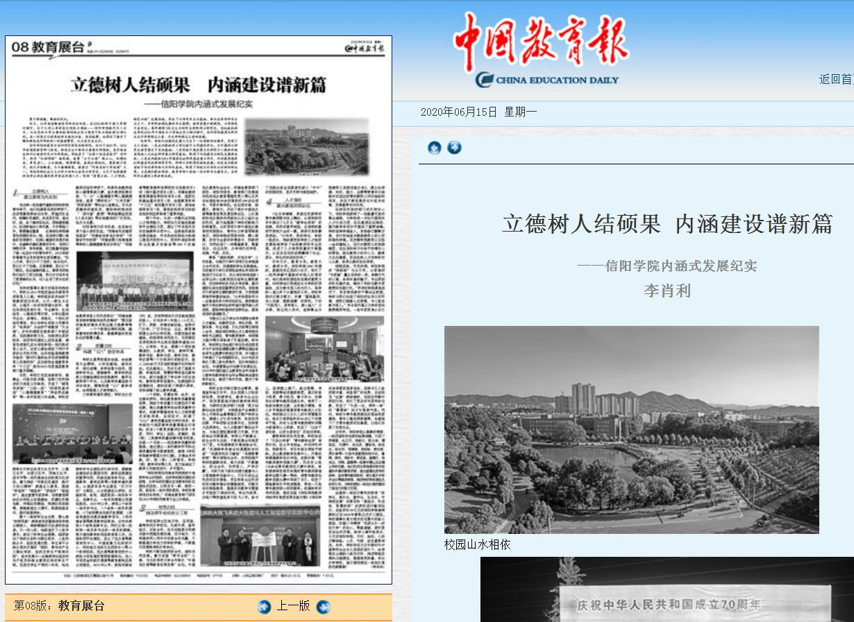 6月15日,《中国教育报》第8版以“立德树人结硕果 内涵建设谱新篇---信阳学院内涵式发展纪实”为题,对我校近年来的办学成就进行了系统报道。文章从“立德树人,建立德育为先机制”“质量立校,构建‘321’教学体系”“特色兴校,推进牵手名校名企工程”“人才强校,建大建强师资队伍”四个方面,深入报道了我校内涵发展的创新举措、典型经验和可喜成绩。