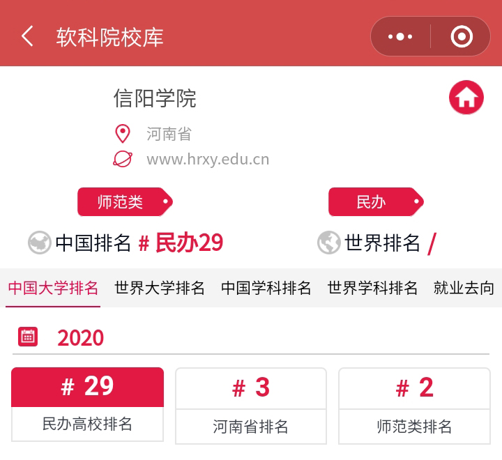 近日,全球领先的高等教育评价机构软科发布了“2020软科中国大学排名”,在全国144所最好民办高校中,信阳学院位于第29名,入列30强。