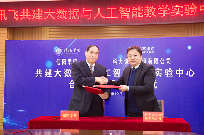 12月8日,我校和科大讯飞股份有限公司举行共建大数据与人工智能教学实验中心合作签约暨揭牌仪式。信阳市人民政府副市长邵春杰,省教育厅高教处处长张水潮、科大讯飞股份有限公司高教人才培养业务副总裁张宣等与我校领导共同见证了签约仪式。双方共建“大数据与人工智能教学实验中心”,是校企双方合作的重要开端,也是信阳学院牵手名企、加强内涵建设的重要举措。